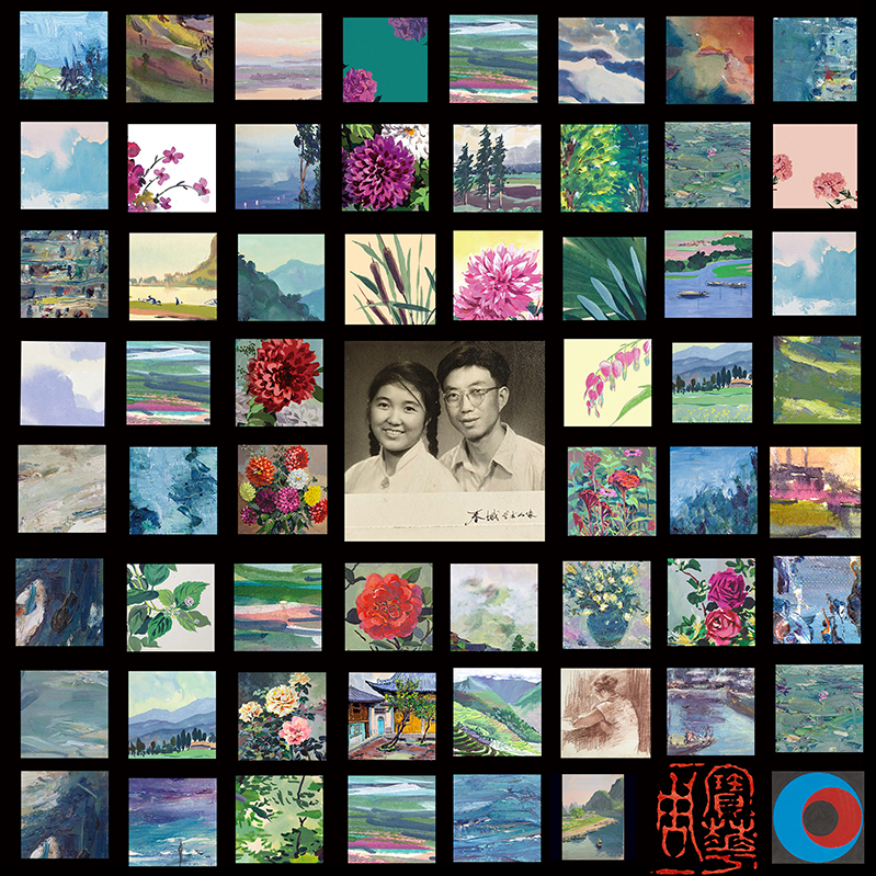 Whispers of Paintings. The second series consists of 59 images, with a black-and-white portrait of my parents at its center, capturing a gentle moment preserved deep in time. My mother’s gouache florals and decorative patterns remain vibrant and delicate; my father’s gouache and oil paintings are calm and warm. Together, their works form a painted diary—recording daily life, inner landscapes, and reflections of each other. In this collage, memories and colors intertwine, letting the years flow quietly within the canvas.